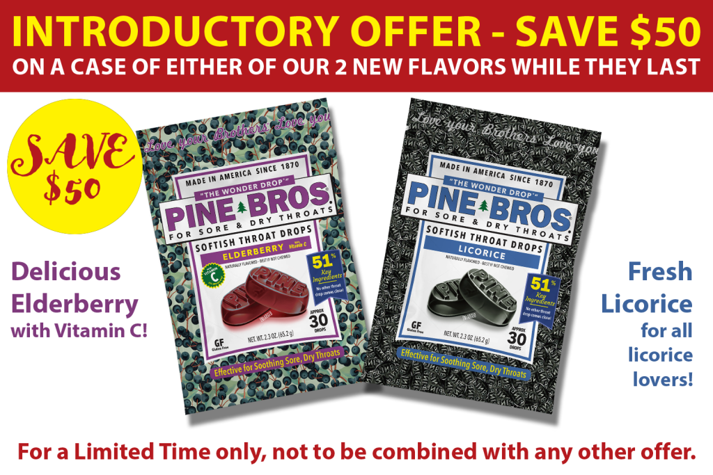 Find Stores Near You Buy in Bulk Buy on Amazon Buy Pine Bros at these Stores Buy Pine Bros in Bulk(1 – 24-piece case)and for a Limited Time receive1 Free additional bag as a thank you(flavor chosen at random) For FREE SHIPPING: At check-out, click on ‘Add Discount’.You will now see the words ‘Discount Code’.Enter “FREE SHIPPING” press Apply. Buy on Amazon Wild Cherry Buy Single Pack Buy Two Pack Buy Four Pack Buy Six Pack Real Honey Buy Single Pack Buy Two Pack Buy Four Pack Buy Six Pack Sugar-Free Wild Cherry Buy Single Pack Buy Two Pack Buy Four Pack Buy Six Pack Licorice Buy Single Pack Buy Two Pack Buy Four Pack Buy Six Pack Elderberry Buy Single Pack Buy Two Pack Buy Four Pack Buy Six Pack
